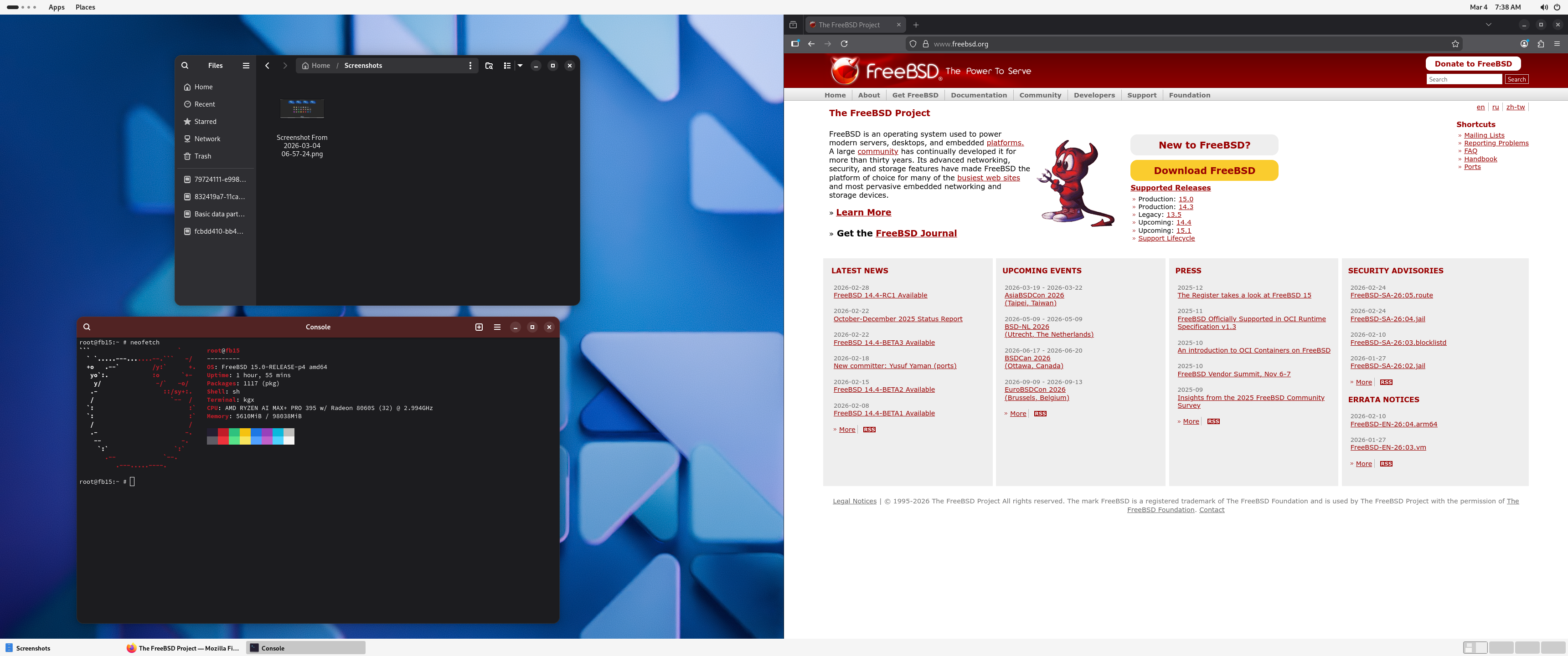 I might try to debug some of these issues, but most likely I’ll just reinstall FreeBSD, and keep using it in text-only mode. As far as I could see, there is no in hardware AI acceleration available on FreeBSD. However, with 32 CPU cores, a fast SSD and 128 GB of RAM, this is an ideal box for running complex test environments in FreeBSD jails. I love Bastille and plan to install it once I cleaned up the machine after the GNOME experiment.